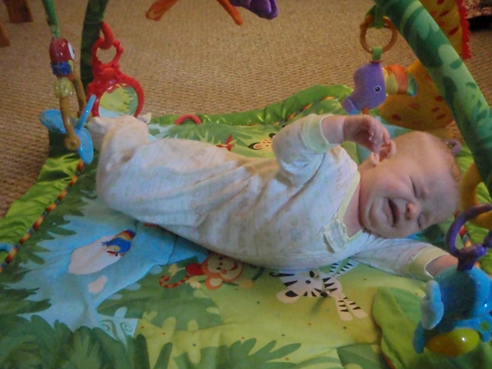 For the coming weeks or months it's more of the same. Absent-minded hand waving and finger-sucking. Then finally they figure out they control their hands and discover they can reach their feet. The process of grabbing their feet from lying on their backs propels them onto their sides. And some get lucky! Some babies are so eager to get to their feet that they launch themselves right onto their stomachs and "Wahoo!! Honey get the camera! Call your mother! Do you think a 5 minute video is too long to post on facebook? Oh who am I kidding, people are going to be dying to see how cute she is!" Other babies, like both of mine, prefer to taunt their parents. Both of my babies for weeks around rolling-over time get themselves at a 45 degree angle from the ground and then roll back the other way. Really? Come on! I must admit that at times the temptation was too great and I just shoved them the rest of the way. Can I count that? I guess not...